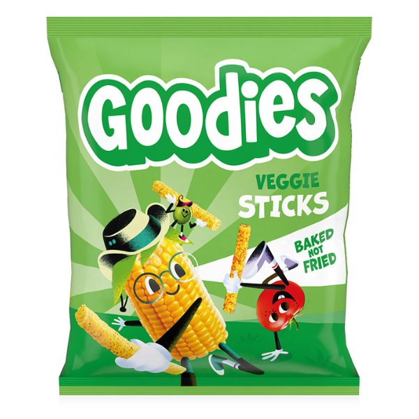 Smag Goodies puffede, sprøde Veggie Sticks lavet af majs og ris med ærter og tomat. En kilde til fiber og perfekt som snack til lidt større børn. Praktisk at pakke som snack i rygsækken, eller når dit barn bare vil have noget godt at gumle på! Bagt, ikke stegt, og uden tilsat salt.