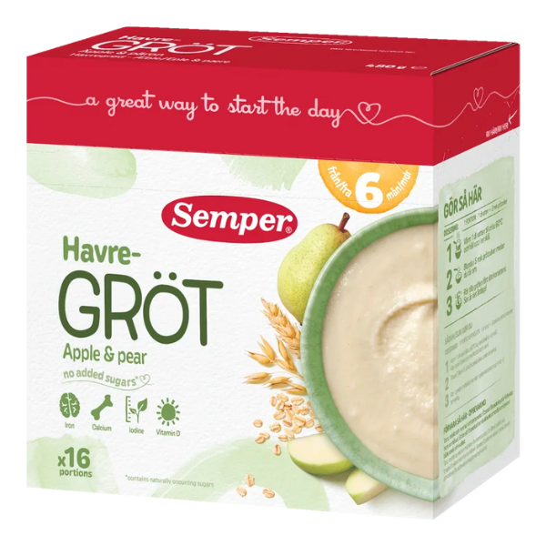Grød er en perfekt start på dagen, også for de mindste. Alle børn har brug for energi for at kunne opdage verden og med Sempers grød får de energi til at tage del i alt det spændende, der sker omkring dem. Semper Havregrød æble & pære er lavet af havre og hvede og er velegnet til baby fra 6 måneder. Vi har også gennemgået og justeret frugt- og bærindholdet i vores opskrifter, så børn vænner sig til en mindre frugtagtig smag af grøden. Sempers grød er i øvrigt velegnet på alle tidspunkter af dagen, fordi den er ernæringsmæssigt komplet!